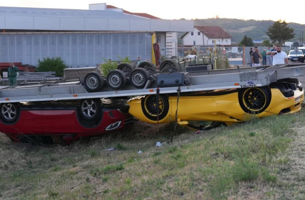 Ένα ατύχημα με ρυμουλκούμενη πλατφόρμα προκάλεσε την ανατροπή δύο πολυτελών αυτοκινήτων, μιας Ferrari 488 GTB και μιας Mercedes-Benz GLA, όταν το λάστιχο της πλατφόρμας κλατάρισε. Παρά την ανατροπή, τα οχήματα παρέμειναν δεμένα, γεγονός που σχολιάστηκε ως απόδειξη της αντοχής των ιμάντων πρόσδεσης. Το περιστατικό, που πιθανώς προκλήθηκε από κακή κατανομή βάρους ή φθαρμένα ελαστικά, προκάλεσε σημαντική οικονομική ζημιά, ειδικά για την ακριβή Ferrari, με την επιδιόρθωση να αναμένεται δύσκολη και δαπανηρή.