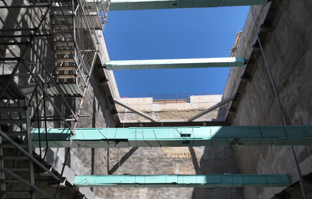 Το συγκεκριμένο φρέαρ στηρίζεται σε μεταλλικές κατασκευές, στις οποίες αυτές τις ημέρες μπορεί να αναπτυχθούν θερμοκρασίες ακόμη και 50ο, 60ο ή και 70ο κελσίου. Οι μηχανικοί της κατασκευάστριας κοινοπραξίας (ΑΒΑΞ – GHELLA – ALSTOM) έχοντας τεράστια εμπειρία από τέτοιας κλίμακας έργα, εφαρμόζουν διάφορες τεχνικές μετριασμού της καταπόνησης των μετάλλων από τον καύσωνα. Είτε επενδύοντας τις αντηρίδες αυτές με ειδικά υλικά, είτε ακόμη και καταβρέχοντας τις μεταλλικές κατασκευές ρίχνοντας τον υδράργυρο σε ανεκτά επίπεδα.