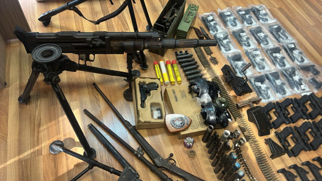 Πολυβόλο όπλο, κάνη πολυβόλου όπλου, 4 μεταλλικές βάσεις πολυβόλου όπλου, 2 μεταλλικά τμήματα πολυβόλου όπλου, κουτί με μεταλλικά τμήματα πολυβόλου όπλου, 2 χειροβομβίδες, καραμπίνα με ξύλινη λαβή, πιστόλι αερίου, 5 αμπούλες αερίου και πλήθος μεταλλικών σφαιριδίων, 2 τρίφτες με υπολείμματα κάνναβης, μαχαίρι συνολικού μήκους 25 εκατοστών, με μήκος λάμας 13 εκατοστά, μεταλλικό μέρος όπλου, 194 κάλυκες, 10 βολίδες πυροβόλων όπλων και 5 φυσίγγια διαφόρων διαμετρημάτων, 2 οπλοβομβίδες, 4 καπνογόνα, 2 μάσκες αερίου με τρία φίλτρα, κινητό τηλέφωνο και φορητός υπολογιστής.