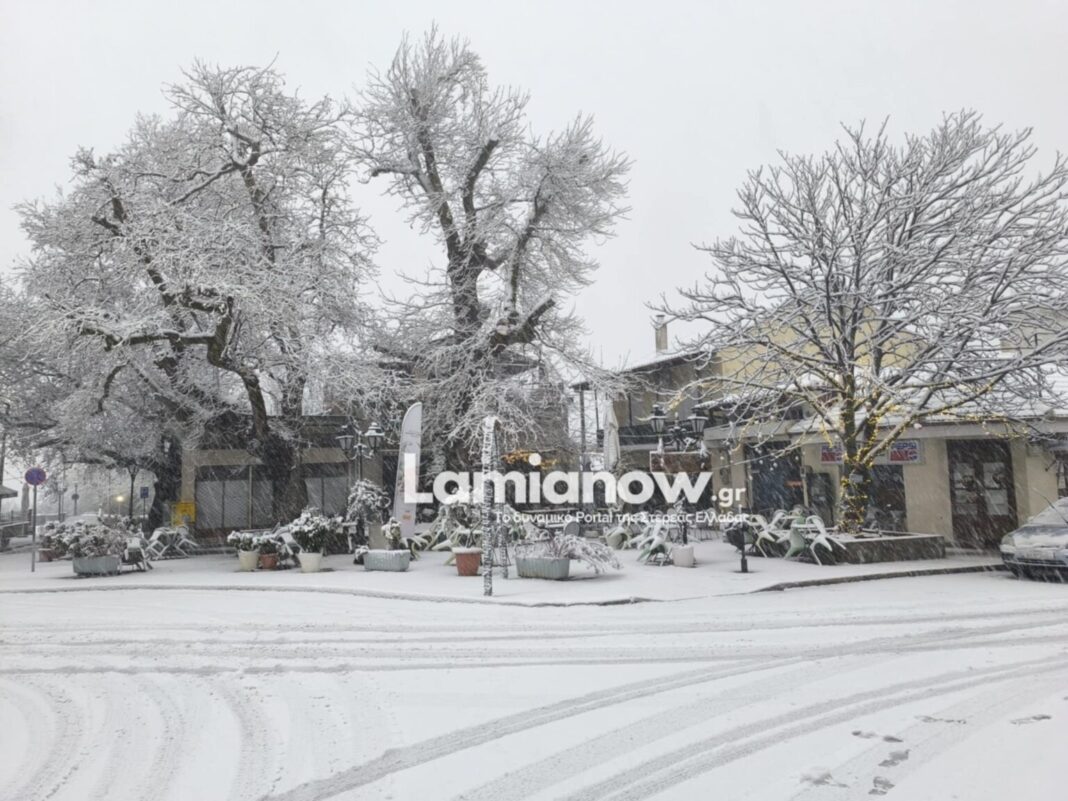 Σε πολλές περιοχές της Φθιώτιδας περίπου στις 8 το πρωί η βροχή γύρισε σε χιόνι, ντύνοντας στα λευκά πολλές περιοχές.