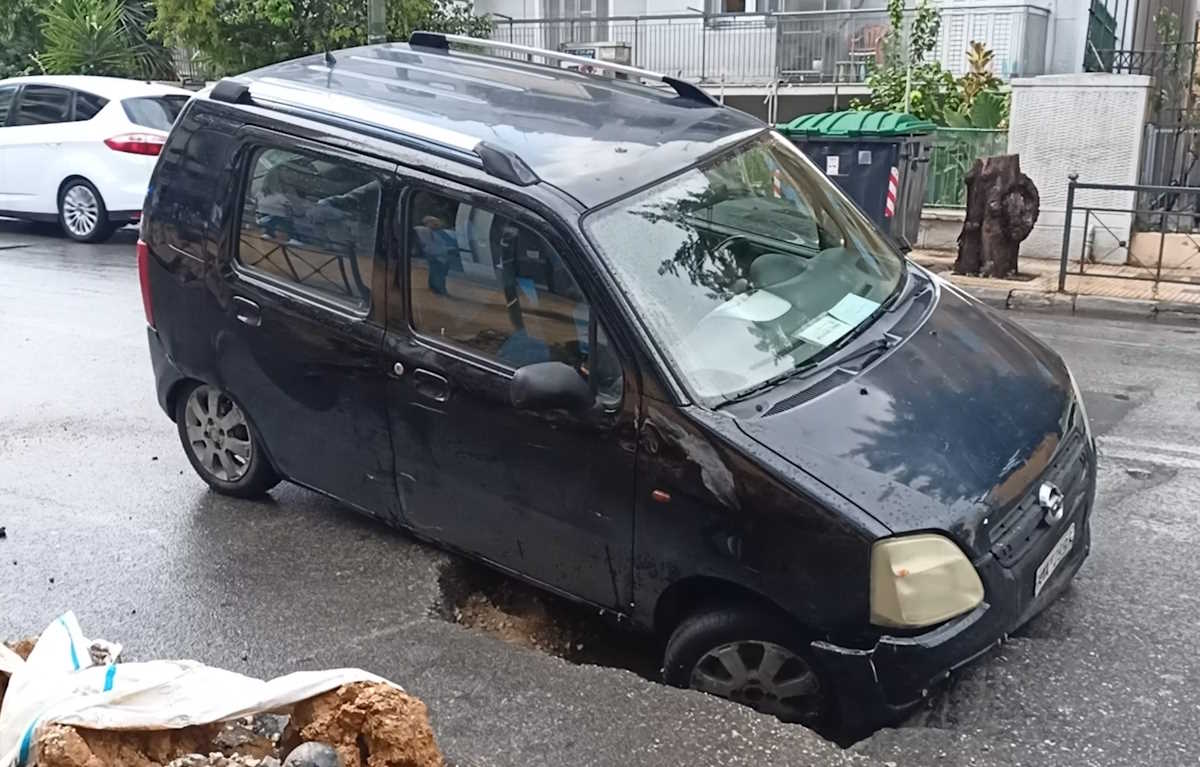 Αυτοκίνητο έπεσε μέσα σε τρύπα στον Άγιο Ελευθέριο Πατησίων – Τραυματίστηκε ο οδηγός, δείτε βίντεο