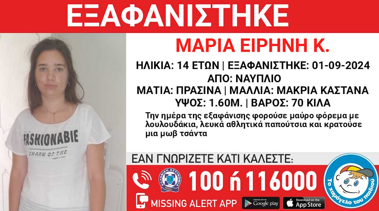 Μεγάλη κινητοποίηση των αρχών στο Ναύπλιο μετά την εξαφάνιση της Μαρίας Ειρήνης 14 ετών. Τον μηχανισμό Missing Kid Alert ενεργοποίησε το «Χαμόγελο του Παιδιού».