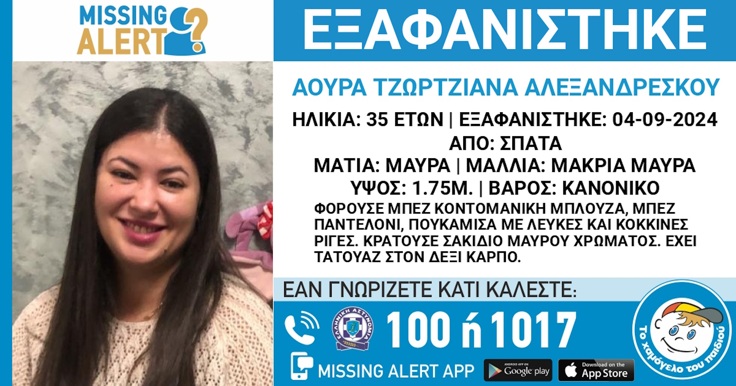 Η ανακοίνωση του «Χαμόγελου του Παιδιού» για την εξαφάνιση της γυναίκας αναφέρει ότι στις 4 Σεπτεμβρίου, στα Σπάτα χάθηκαν τα ίχνη της .) Αούρα Τζωρτζιάνα Αλεξανδρέσκου, 35 ετών.