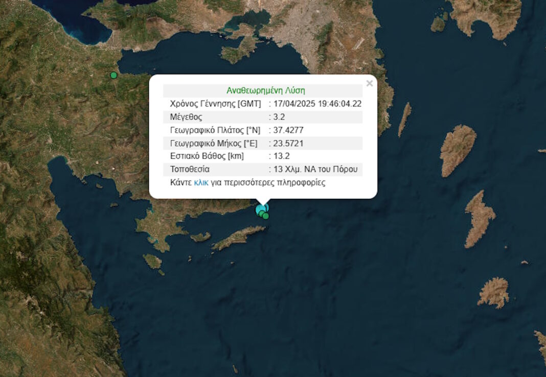 Λίγα λεπτά αργότερα και συγκεκριμένα στις 21.46 έγινε δεύτερος σεισμός στον Αργοσαρωνικό, σε πολύ κοντινή απόσταση με τον πρώτο, 10 χιλιόμετρα από τον Πόρο.