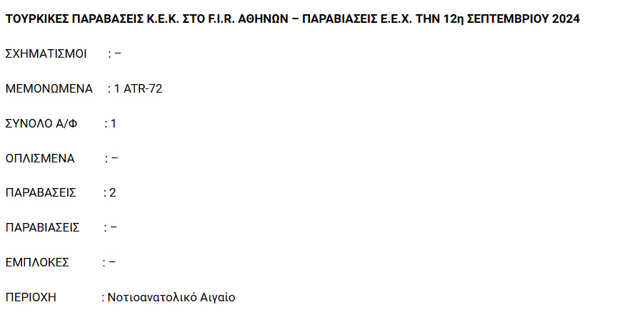 Σε παραβάσεις των κανόνων εναέριας κυκλοφορίας στο FIR Αθηνών προχώρησε τουρκικό αεροσκάφος, όπως ανακοίνωσε σήμερα 12.9.2024 το Γενικό Επιτελείο Εθνικής Άμυνας (ΓΕΕΘΑ).
