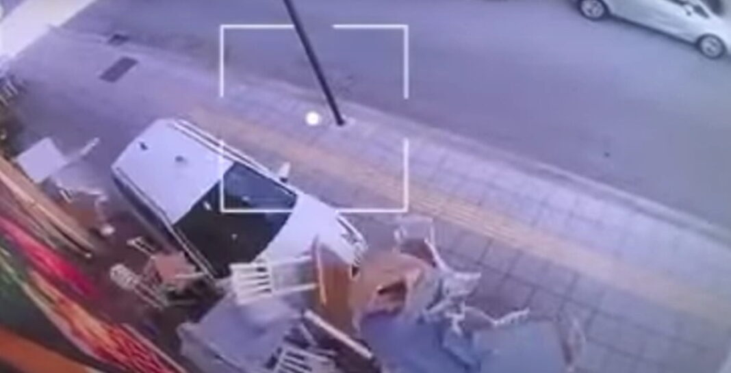 Βίντεο έχει καταγράψει την τρελή πορεία του οχήματος, το οποίο αφού αρχικά ανέβηκε στο πεζοδρόμιο, στη συνέχεια πήρε σβάρνα τα τραπεζοκαθίσματα καταστήματος εστίασης.