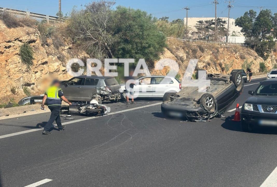 Καραμπόλα σημειώθηκε το απόγευμα της Παρασκευής στον Βόρειο Οδικό Άξονα Κρήτης, στο ρεύμα από Ηράκλειο προς Άγιο Νικόλαο, κοντά στο Αστυνομικό Μέγαρο. Εμπλέκονταν αυτοκίνητα, φορτηγό, mini bus και μηχανή, με αποτέλεσμα ένα ΙΧ να αναποδογυρίσει. Δύο άτομα, η οδηγός του αυτοκινήτου και ο οδηγός της μηχανής, τραυματίστηκαν και μεταφέρθηκαν στο Πανεπιστημιακό Νοσοκομείο Ηρακλείου, χωρίς να κινδυνεύει η ζωή τους. Στο σημείο έσπευσε η Τροχαία για να ρυθμίσει την κυκλοφορία και να διερευνήσει τα αίτια του ατυχήματος. Πιο αναλυτικά