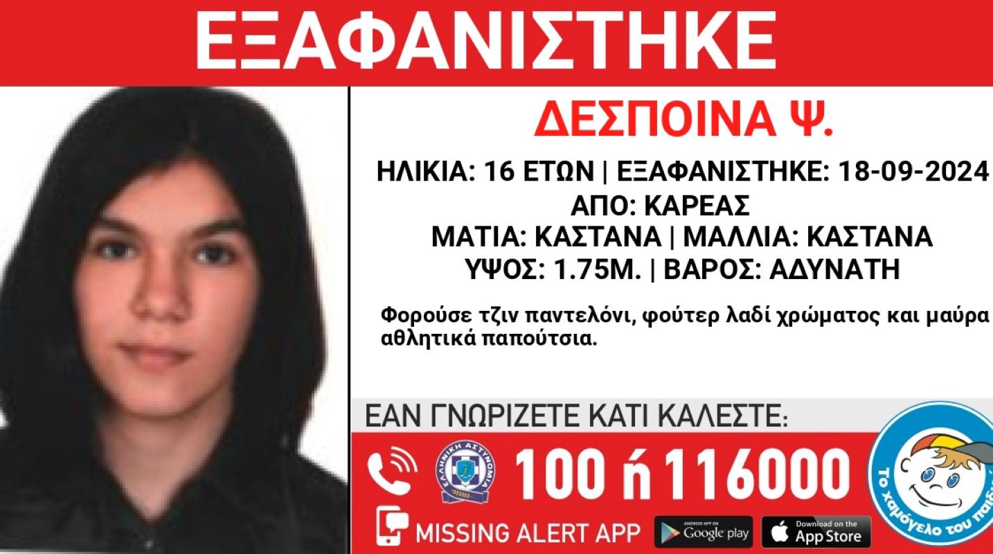 Σύμφωνα με ανακοίνωση που εξέδωσε το «Χαμόγελο του Παιδιού», τα ίχνη της 16χρονης Δέσποινας Ψ., χάθηκαν χθες Τετάρτη (18.09.2024) από την περιοχή του Καρέα.