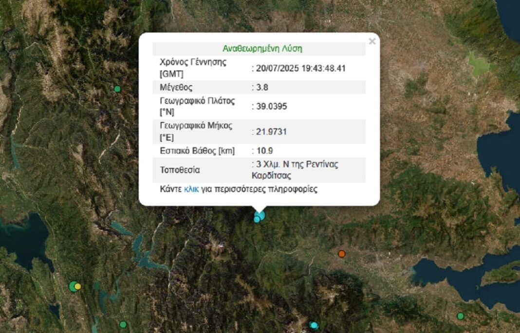 Σεισμός 3,8 Ρίχτερ σημειώθηκε το βράδυ της Κυριακής (20/07/2025) στην Καρδίτσα και συγκεκριμένα τρία χιλιόμετρα νότια της Ρεντίνας.