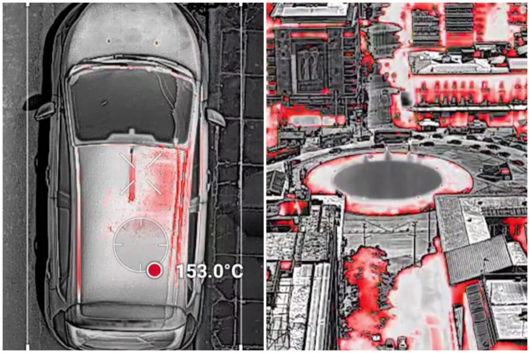 Για του λόγου το αληθές, το drone του Up Stories κατέγραψε σήμερα (24.07.2025) με θερμική κάμερα θερμοκρασία μέχρι και 153° Κελσίου στην οροφή ενός αυτοκινήτου, που βρισκόταν στη Λένορμαν.