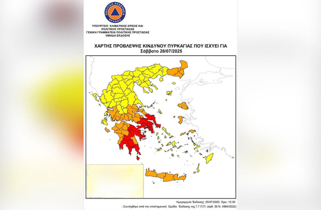 Το Υπουργείο Κλιματικής Κρίσης και Πολιτικής Προστασίας εξέδωσε προειδοποίηση για ακραίο κίνδυνο πυρκαγιάς (κατηγορία κινδύνου 5) για αύριο, Σάββατο 26 Ιουλίου 2025. Η κατάσταση είναι ακραία, με τον κίνδυνο να ξεπερνά κάθε προηγούμενο φετινό επίπεδο.