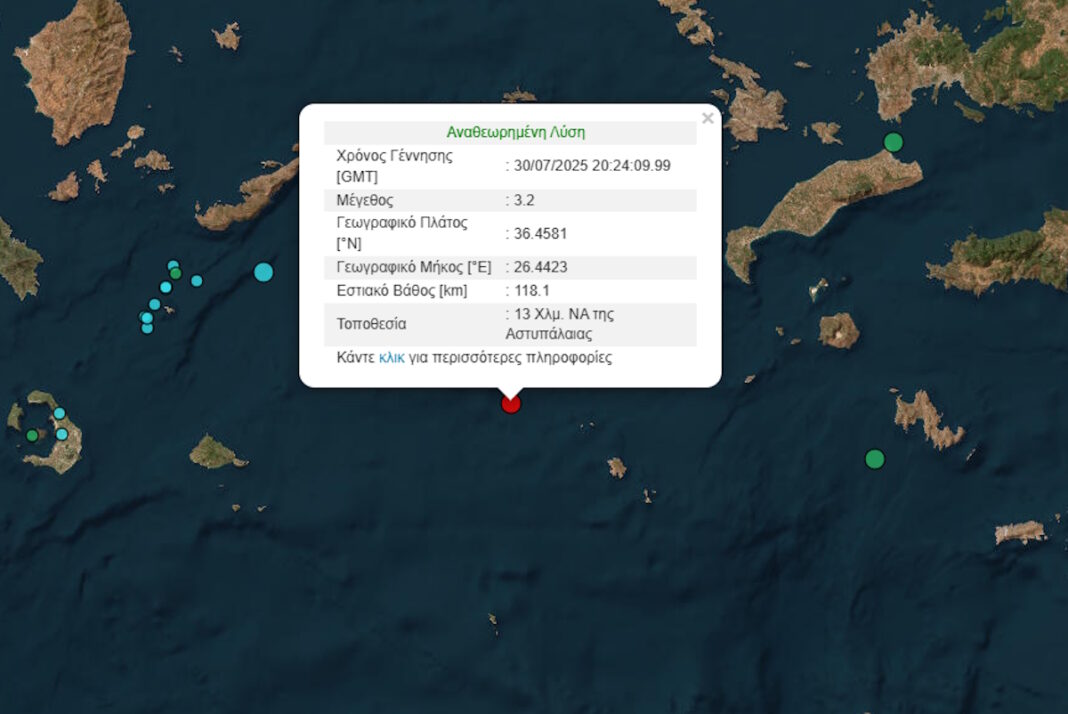 Σεισμός μεγέθους 3,2 βαθμών της κλίμακας Ρίχτερ σημειώθηκε στην Αστυπάλαια στις 11:24 το βράδυ της Τετάρτης (30.07.2025).