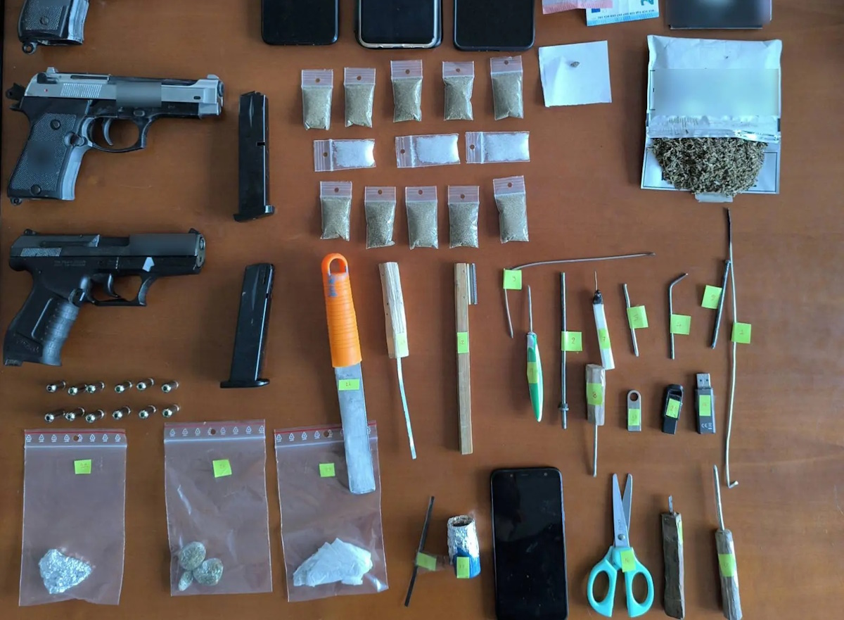 Κατά τη διάρκεια του σωματικού ελέγχου και των ερευνών που έγιναν στα σπίτια τους βρέθηκαν, 29,23 γραμ. κάνναβης, 8,17 γραμ. μεθαμφεταμίνης, 22,65 γραμ. φυτικών αποσπασμάτων ναρκωτικής ουσίας, 3 κινητά τηλέφωνα, 30 ευρώ, 3 συσκευασίες καρτών κινητής τηλεφωνίας, 0,09 γραμμ. ηρωνίνης, 3 πιστόλια και 12 αβολίδωτα φυσίγγια.