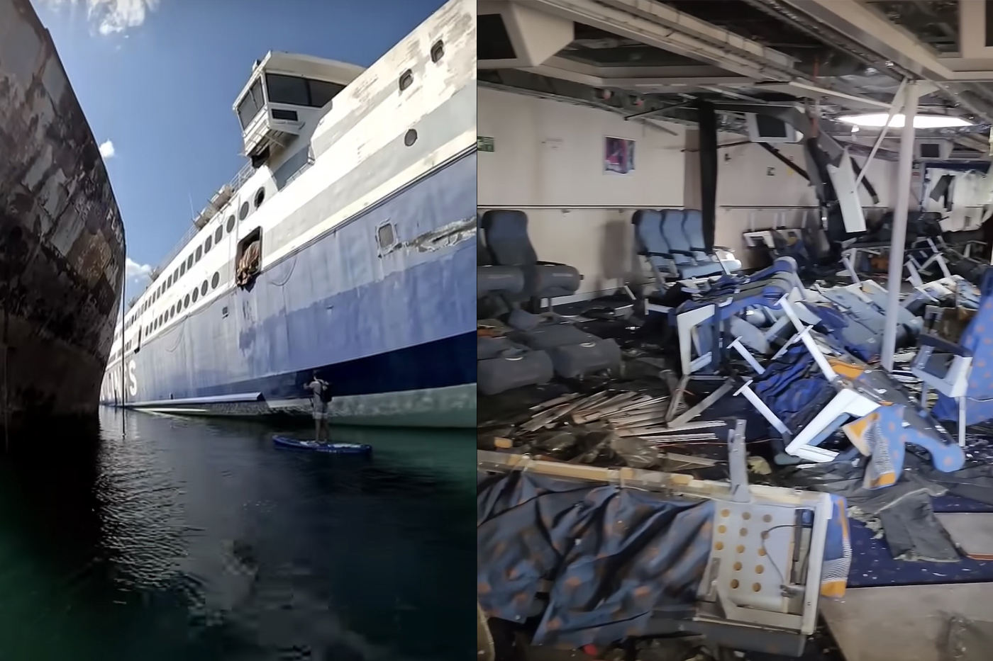 Η ομάδα ερασιτεχνών ερευνητών έφτασε μέχρι τις σκάλες με τη χρήση sup και κατέγραψε αποκαρδιωτικές εικόνες από το σκουριασμένο, μισοβυθισμένο, άδειο, γεμάτο σκουπίδια πλοίο με και το θρυλικό του σαλόνι διαλυμένο.