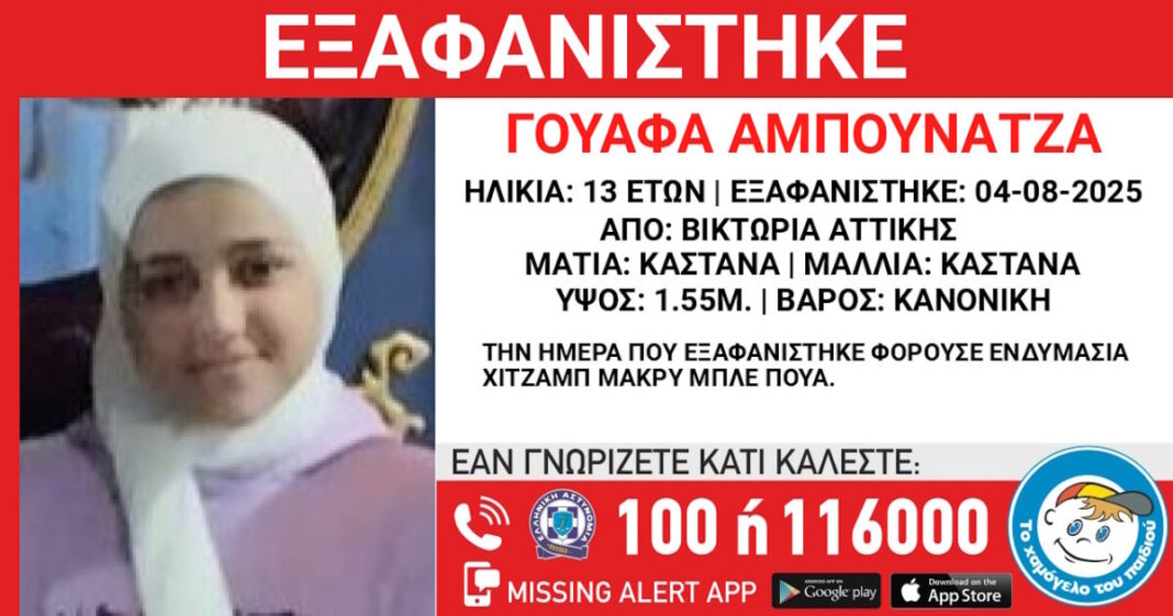 Το «Χαμόγελο του Παιδιού» ανακοίνωσε την εξαφάνιση της 13χρονης Γουάφα Αμπουνάτζα, παλαιστινιακής καταγωγής, από την περιοχή της Βικτώριας.