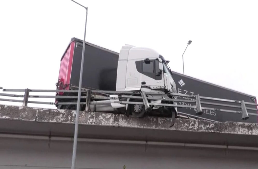 Άγιο είχε ένας οδηγός νταλίκας που έχασε τον έλεγχο του οχήματος στη Θεσσαλονίκη και κατέληξε στα κιγκλιδώματα γέφυρας, ενώ το μπροστινό τμήμα του φορτηγού βρέθηκε στον αέρα.