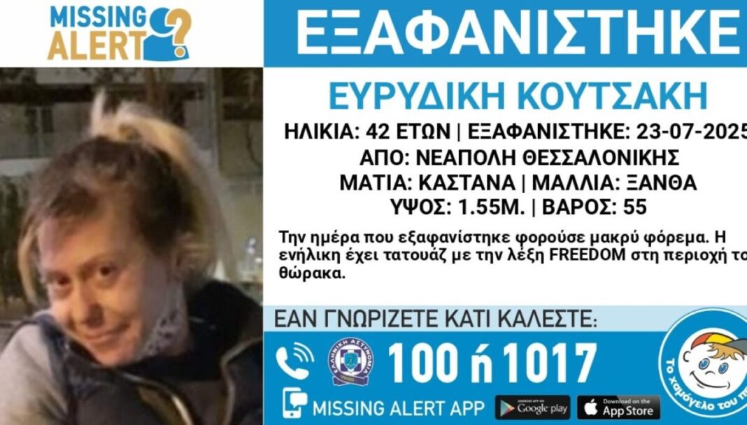 Η 42χρονη Ευρυδίκη Κουτσάκη αγνοείται από τις 23 Ιουλίου 2025 στη Νεάπολη Θεσσαλονίκης, προκαλώντας αγωνία στην οικογένειά της.