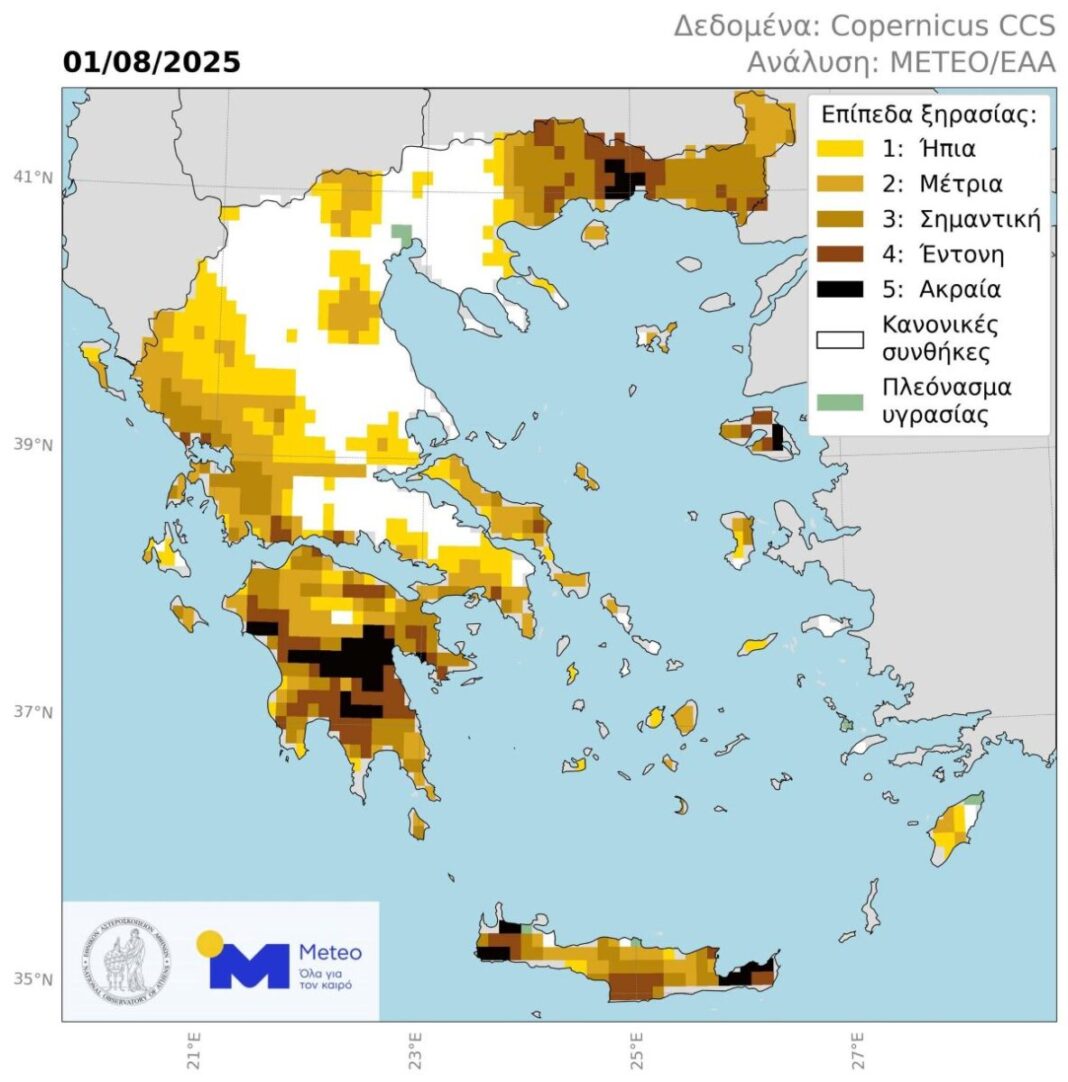 Aνάλυση του meteo του Εθνικόν Αστεροσκοπείον Αθηνών, καταγράφει τον δείκτη ξηρασίας στην Ελλάδα την 1η Αυγούστου 2025.