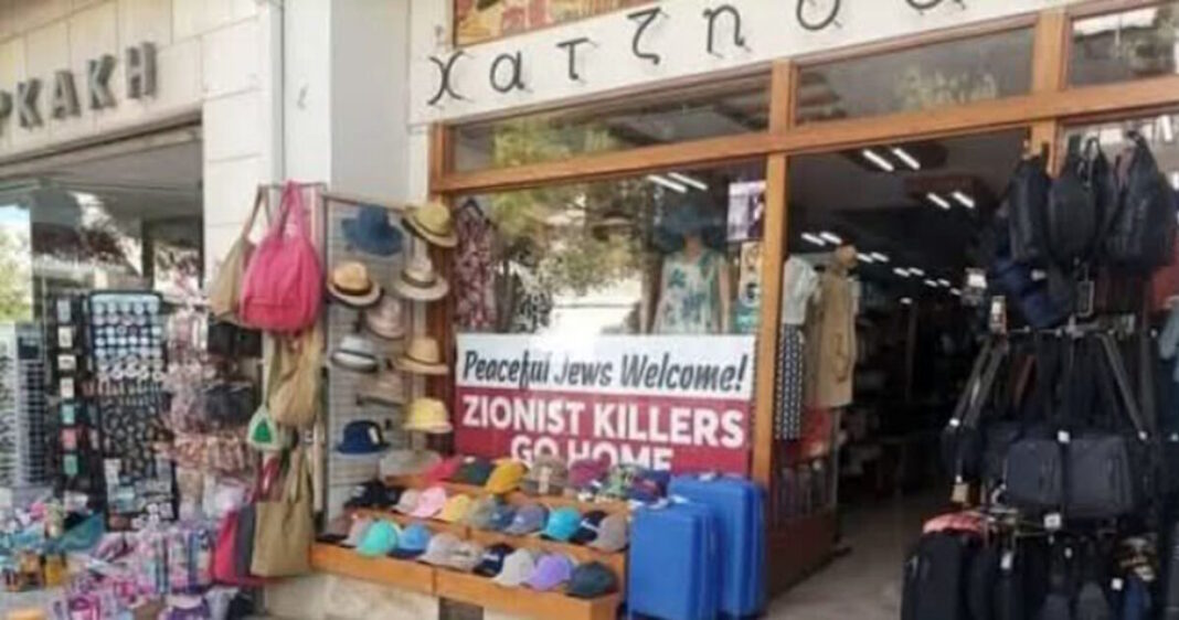 Η αφίσα στη βιτρίνα κεντρικού εμπορικού καταστήματος στον Άγιο Νικόλαο στο Λασίθι, με σύνθημα «Ισραηλινέ που είσαι φιλειρηνικός, είσαι καλοδεχούμενος… Σιωνιστή, γύρνα πίσω στην πατρίδα σου», ενόχλησε τον Ισραηλινό που είχε αποβιβαστεί από το κρουαζιερόπλοιο «Crown Iris».