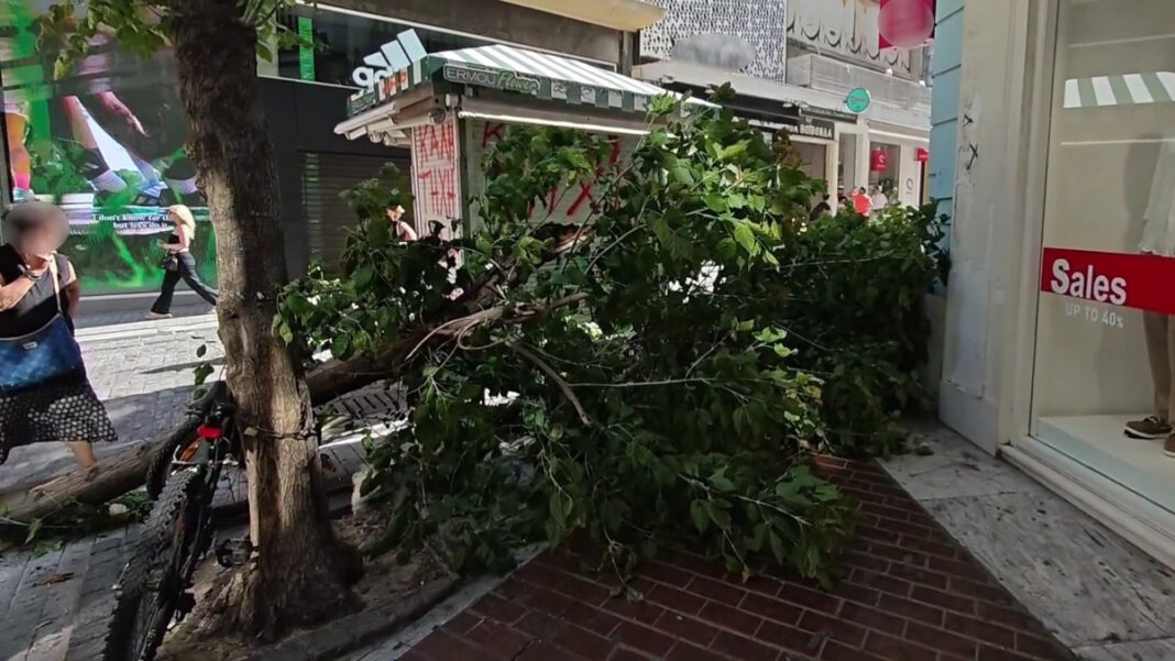 Από τύχη δεν τραυματίστηκε κανένας περαστικός το πρωί της Πέμπτης (07.08.2025) στην Ερμού. Λόγω των ισχυρών ανέμων που πνέουν στην Αθήνα, ένα μεγάλο δέντρο έσπασε και έπεσε με δύναμη στο έδαφος.