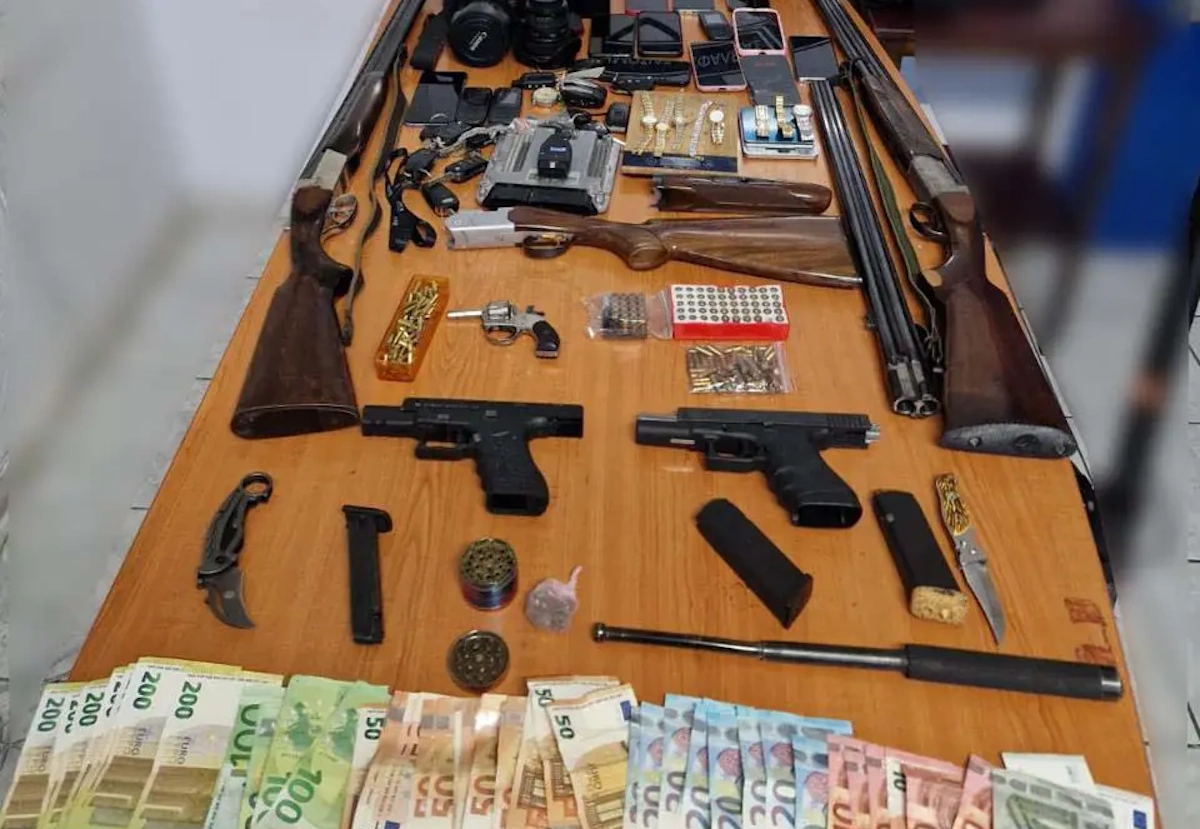 Συνολικά, από τις έρευνες που έγιναν σε σπίτια και λοιπούς χώρους αποθήκευσης κλοπιμαίων βρέθηκαν –μεταξύ άλλων- και κατασχέθηκαν 39 κινητά τηλέφωνα, όπλα, φυσίγγια, κάνναβη, αναδιπλώμενα σουγιάδες, γκλοπ, 3 μοτοσυκλέτες και