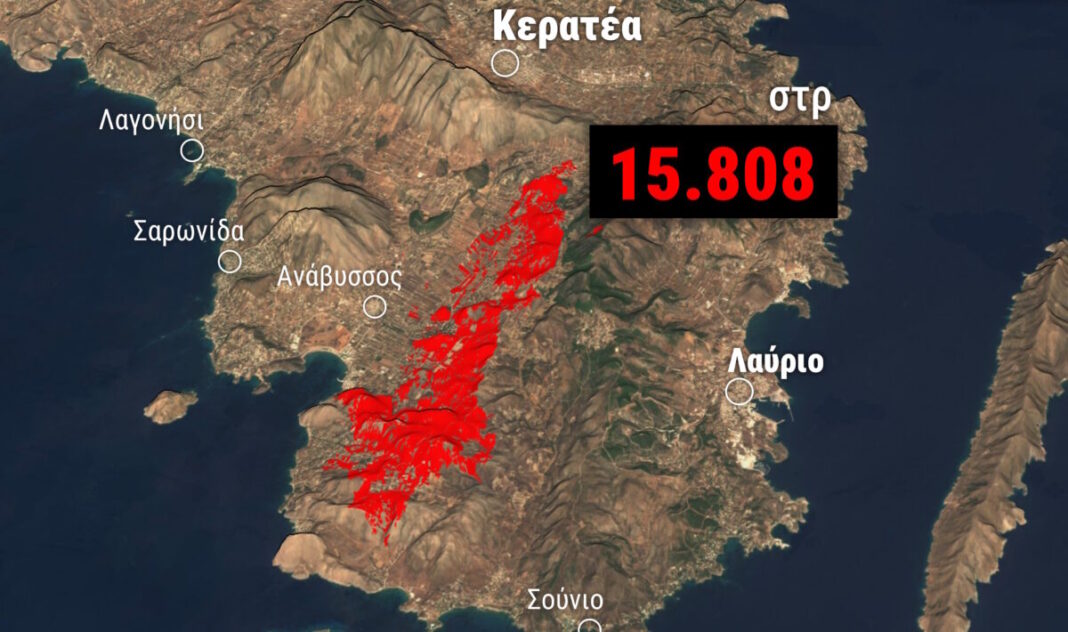 Στα 15.808 στρέμματα υπολογίζεται η συνολική έκταση που επλήγη από τη μεγάλη φωτιά που ξέσπασε την Παρασκευή (08.08.2025) στην Κερατέα και εξαπλώθηκε σε περιοχές της νοτιοανατολικής Αττικής.