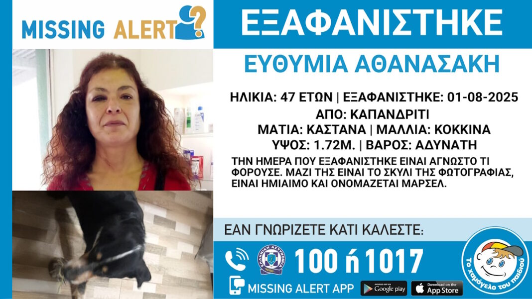 Στην ανακοίνωση του «Χαμόγελου του Παιδιού» για την εξαφάνιση αναφέρεται ότι τα ίχνη της 47χρονης Ευθυμίας Αθανασάκη χάθηκαν από το Καπανδρίτι την 1η Αυγούστου.