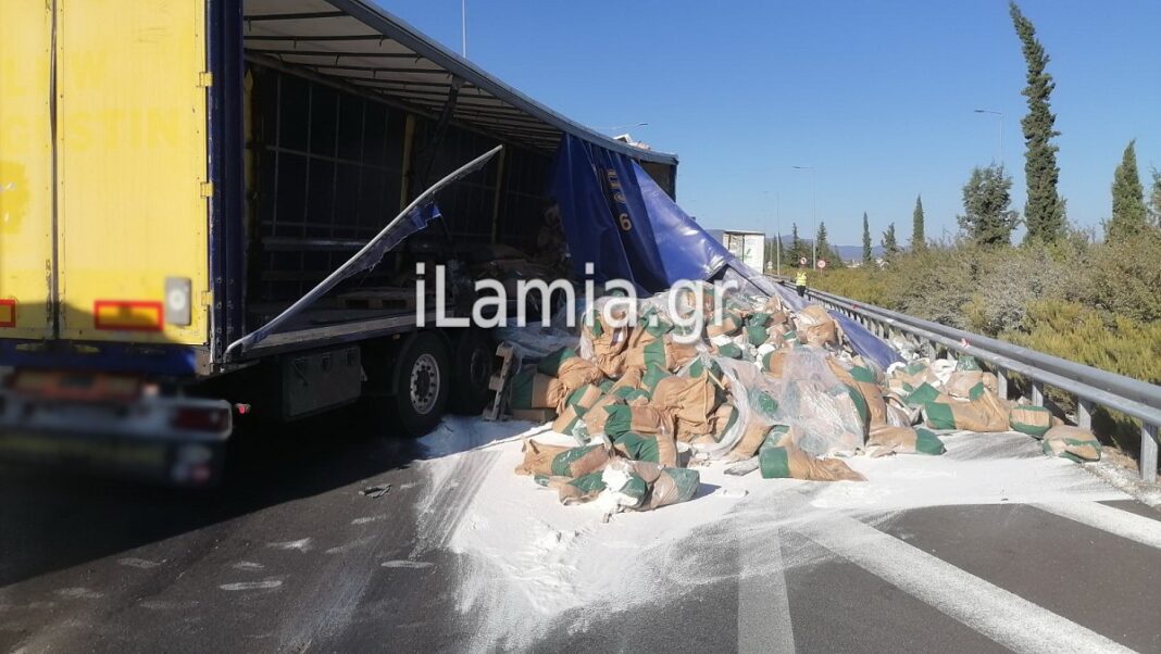 Το ρεύμα προς Λαμία έκλεισε καθώς η νταλίκα ήταν φορτωμένη με αλεύρι, το οποίο σκόρπισε στην άσφαλτο. Η κυκλοφορία γίνεται με εκτροπή των οχημάτων από τον κόμβο της Αγίας Μαρίνας μέχρι και τον κόμβο της Αγίας Παρασκευής.