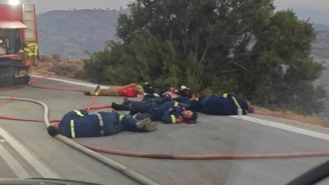 Μια συγκλονιστική φωτογραφία που κυκλοφόρησε δείχνει εξαντλημένους πυροσβέστες να κοιμούνται στη μέση του δρόμου, προσπαθώντας να ανακτήσουν δυνάμεις για να συνεχίσουν το έργο τους.