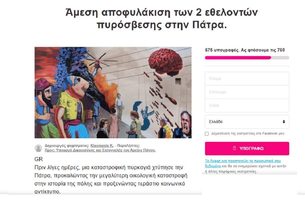 Υπογραφές με σκοπό την άμεση αποφυλάκιση του 25χρονου και του 21χρονου, που κατηγορούνται για εμπρησμό στην περιοχή του Γηροκομείου, στην Πάτρα, την Τετάρτη 13 Αυγούστου, συγκεντρώνονται μέσω διαδικτυακής πλατφόρμας.