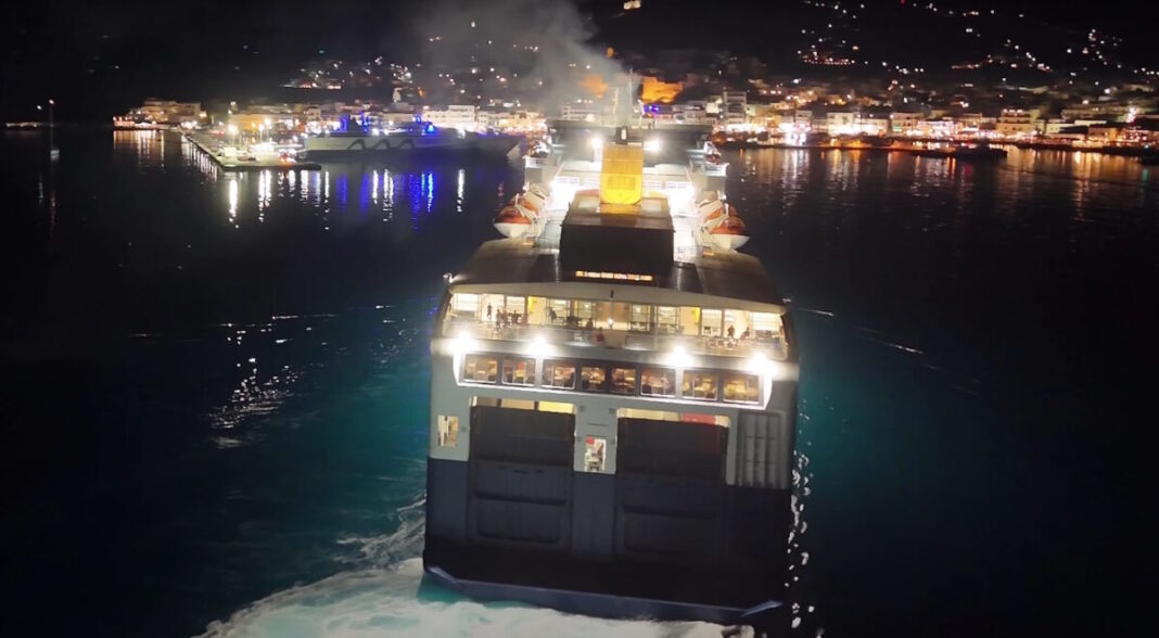 Το τεράστιο επιβατηγό – οχηματαγωγό δένει σε ελάχιστα λεπτά και με ακρίβεια στο λιμάνι του νησιού.