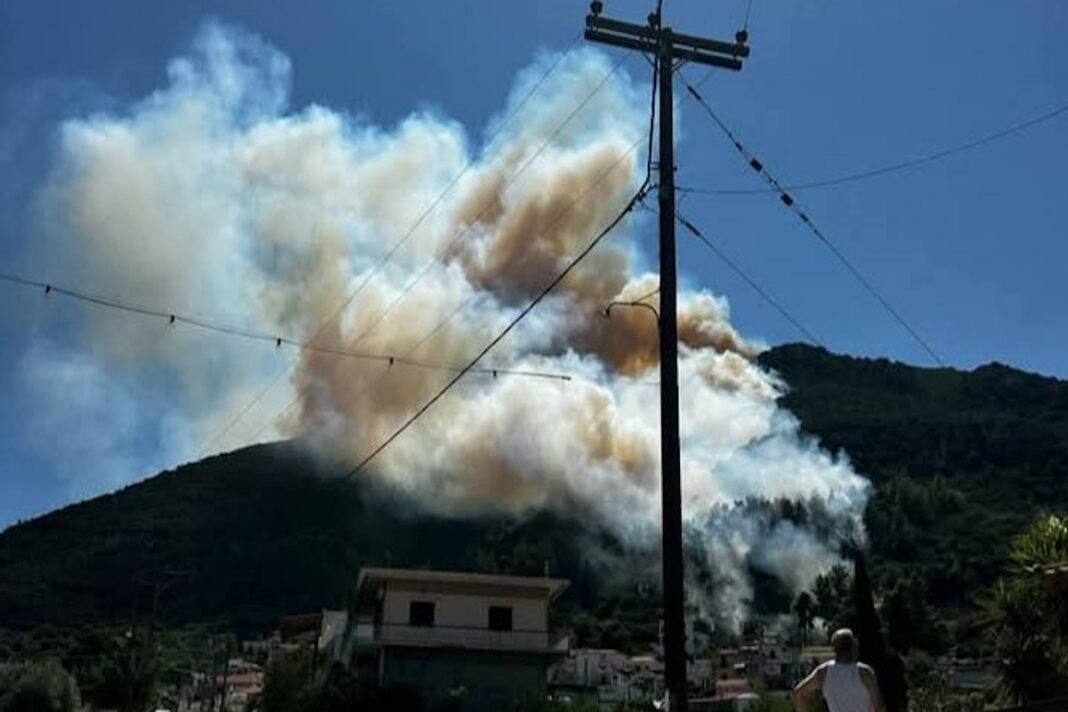 Η φωτιά στην Τροιζηνία Αργολίδας καίει σε δασική έκταση και στο σημείο πνέουν αρκετά ισχυροί άνεμοι και υπάρχουν κοντά σπίτια.