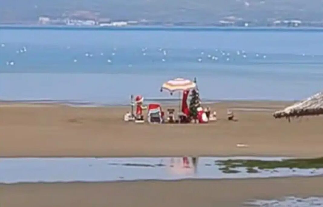 Στην παραλία Λιανή Άμμος της Χαλκίδας, ένας άνδρας αποφάσισε να φέρει το πνεύμα των Χριστουγέννων νωρίτερα, φορώντας τη στολή του Αϊ Βασίλη και προκαλώντας έκπληξη στους λουόμενους. Με την χαρακτηριστική κόκκινη στολή, ο "Αϊ Βασίλης" απολάμβανε τον ήλιο και τη θάλασσα, ενώ γύρω του υπήρχαν κόκκινα ρούχα και πετσέτες, καθώς και ένα Χριστουγεννιάτικο δέντρο. Το ασυνήθιστο αυτό θέαμα προκάλεσε χαμόγελα και αμηχανία στους παρευρισκόμενους, φέρνοντας μια δόση χριστουγεννιάτικης μαγείας στο καλοκαίρι.