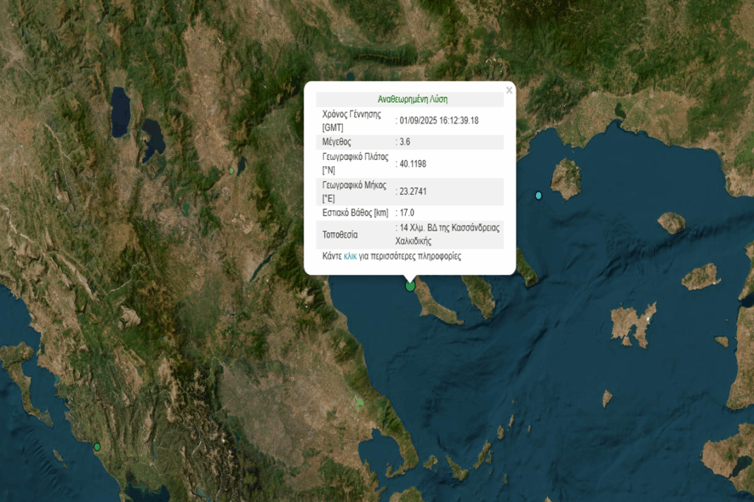 Σεισμός μεγέθους 3,6 Ρίχτερ σημειώθηκε σήμερα, Δευτέρα (1/9/2025), λίγο μετά τις 19:00 στη Χαλκιδική και το επίκεντρο εντοπίστηκε στην Κασσάνδρα.