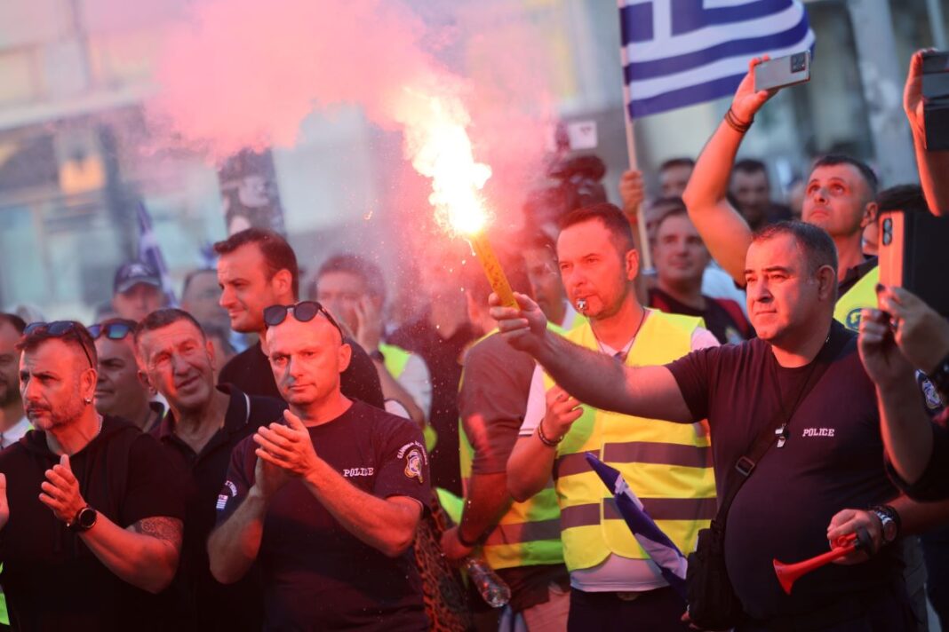 Στη Θεσσαλονίκη, οι ένστολοι των Σωμάτων Ασφαλείας και των Ενόπλων Δυνάμεων πραγματοποίησαν διαμαρτυρία με πυρσούς, κόρνες και συνθήματα, ζητώντας αξιοπρέπεια, αυξήσεις μισθών και σύγχρονο εξοπλισμό.