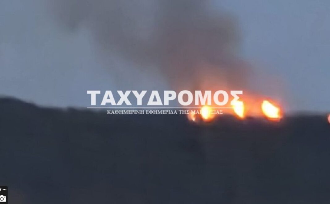 Η φωτιά καίει χαμηλή βλάστηση σε δύσβατο σημείο και μακριά από κατοικημένη περιοχή στο Βόλο.
