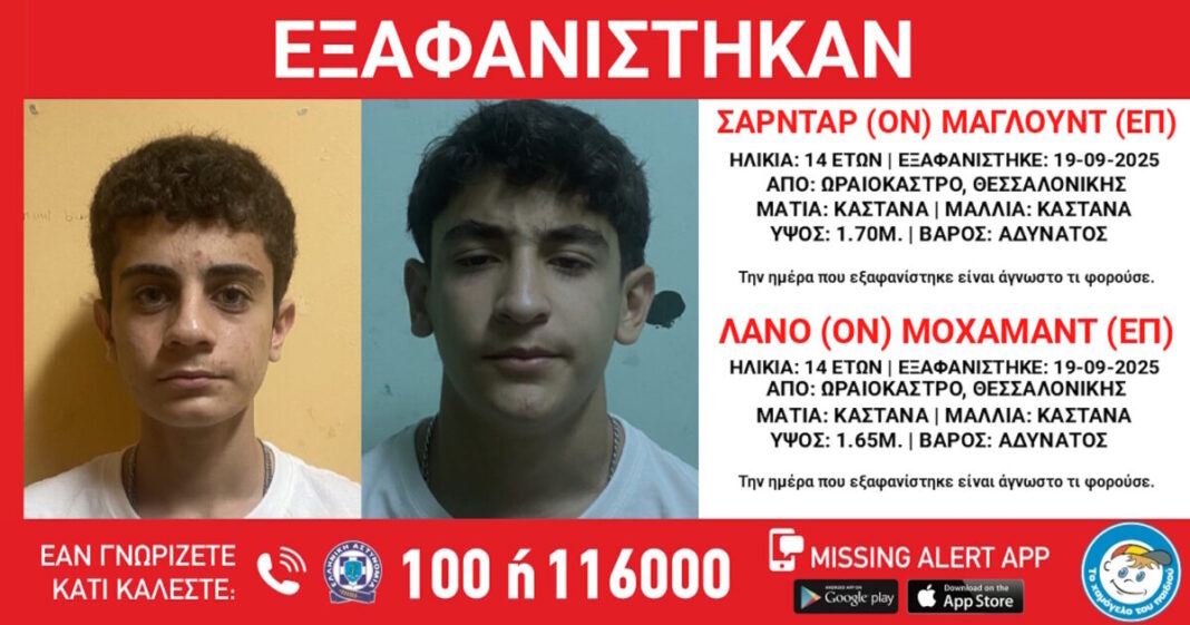 Στη Θεσσαλονίκη, αγωνία επικρατεί για την εξαφάνιση δύο 14χρονων αγοριών ιρακινής καταγωγής από το Ωραιόκαστρο, όπως ανακοίνωσε το «Χαμόγελο του Παιδιού». Τα ίχνη των Λάνο Μοχαμάντ και Σαρντάρ Μαγλούντ χάθηκαν στις 19 Σεπτεμβρίου από χώρο φιλοξενίας, με τις αρχές να ανησυχούν για την ασφάλειά τους. Το «Χαμόγελο του Παιδιού» δημοσιοποίησε τα στοιχεία τους κατόπιν εισαγγελικής εντολής και καλεί όποιον έχει πληροφορίες να επικοινωνήσει άμεσα μέσω της Ευρωπαϊκής Γραμμής για τα Εξαφανισμένα Παιδιά 116000 ή με τα αστυνομικά τμήματα.