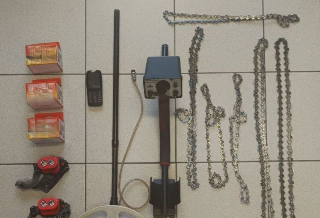 Ένα κινητό τηλέφωνο, έξι ανταλλακτικές αλυσίδες αλυσοπρίονου που χρησιμοποιούσαν για την παράνομη υλοτομία, πέντε φακοί κεφαλής για χρήση κατά τις νυχτερινές ώρες και ένας πλήρης ανιχνευτής μετάλλων, χωρίς άδεια κατοχής από την αρμόδια Αρχή.
