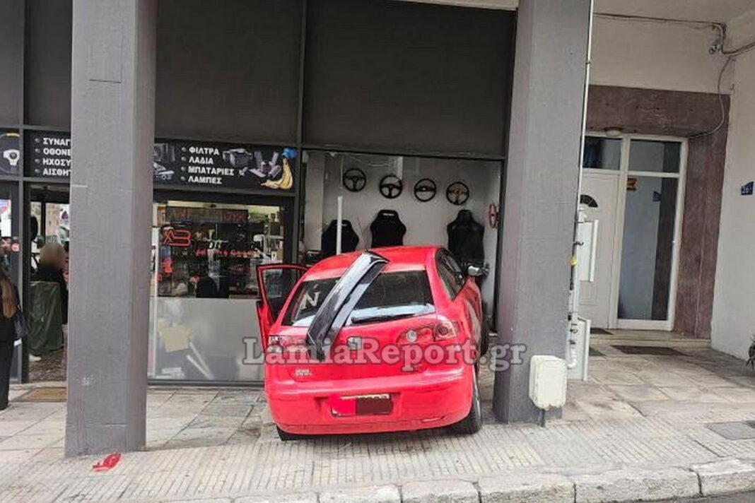 Απρόσμενη εκτροπή οχήματος στη Λαμία: Αυτοκίνητο γλιστρά και καταλήγει σε βιτρίνα καταστήματος χωρίς ανθρώπινα θύματα