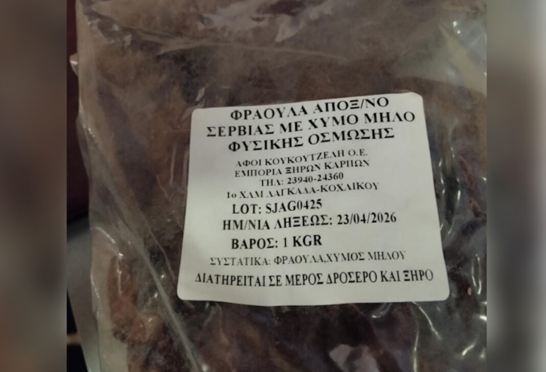 Πρόκειται για προϊόν προέλευσης Σερβίας σε πλαστική κλειστή συσκευασία 1Kg, με αριθμό παρτίδας SJAG0425 και ανάλωση κατά προτίμηση πριν από: 23/04/2026 που διατίθεται από την επιχείρηση «ΑΦΟΙ ΚΟΥΚΟΥΤΖΕΛΗ ΟΕ» με έδρα στον 1ο χλμ Λαγκαδά – Κολχικού.