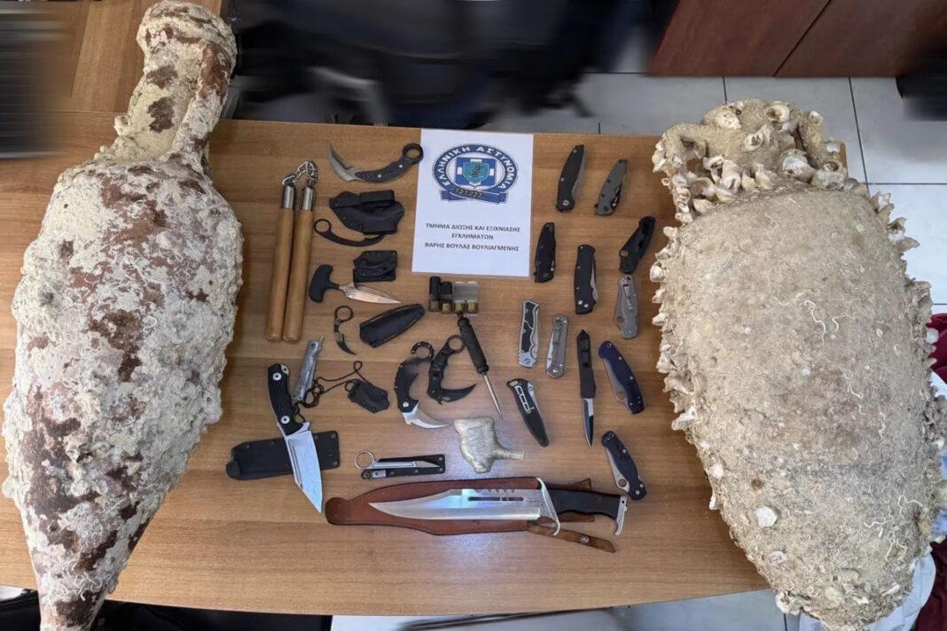 Στη Βουλιαγμένη, ένας 47χρονος συνελήφθη όταν οι αρχές ανακάλυψαν στο σπίτι του πλήθος μαχαιριών και αρχαία κεραμικά αγγεία, προκαλώντας ερωτήματα για την κατοχή τους. Συγκεκριμένα, βρέθηκαν 19 μαχαίρια, ένα όπλο πολεμικών τεχνών, ένα στιλέτο, κυνηγετικά φυσίγγια και δύο αρχαίοι αμφορείς του 5ου αιώνα π.Χ. Ο άνδρας κατηγορείται για παραβάσεις της νομοθεσίας περί όπλων και προστασίας αρχαιοτήτων και οδηγήθηκε στον Εισαγγελέα.