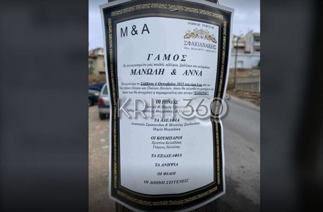 Σύμφωνα με το kriti360.gr, ο ιδιοκτήτης του γραφείου τελετών Σφακιανάκη στα Χανιά αποφάσισε να ανακοινώσει τον γάμο του γιου του σήμερα Σάββατο (4.10.25) στα Χανιά με… κηδειόχαρτο.