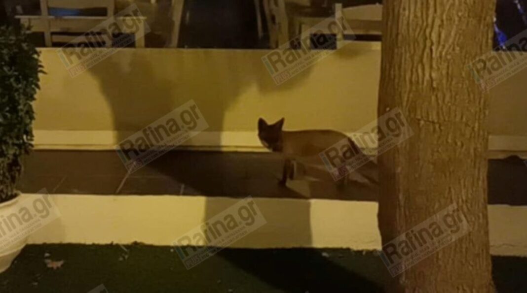 Στην κεντρική πλατεία της Ραφήνας, ένα τραυματισμένο και εξαντλημένο αλεπουδάκι εμφανίστηκε τα ξημερώματα της Τετάρτης, αναζητώντας τροφή ανάμεσα στα τραπέζια των καταστημάτων.