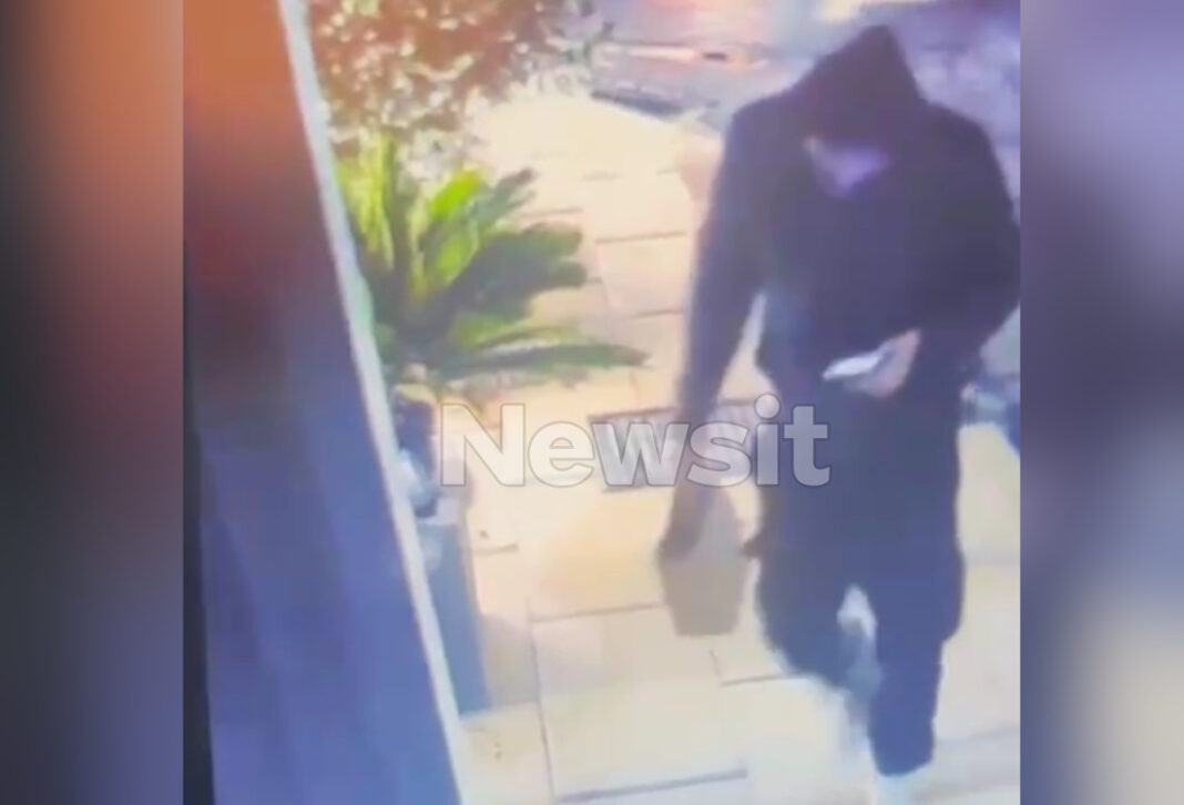Ο άνδρας, φορώντας κουκούλα και μάσκα, καταγράφεται από κάμερα ασφαλείας να αφήνει μια χάρτινη τσάντα με τη βόμβα στην είσοδο του μαγαζιού και να απομακρύνεται.