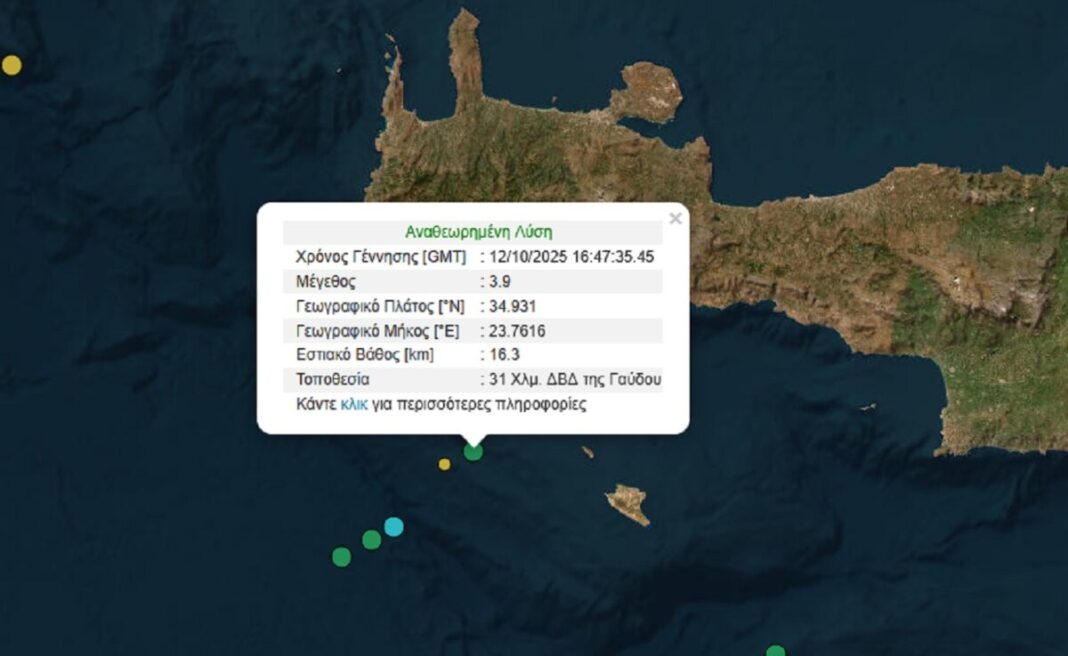 Σεισμός 3,9 Ρίχτερ σημειώθηκε το απόγευμα της Κυριακής 12 Οκτωβρίου νότια της Κρήτης και κοντά στη Γαύδο.