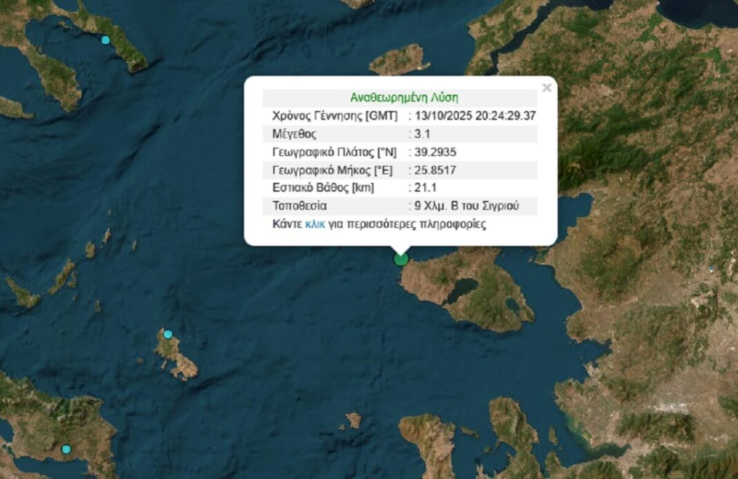 Σεισμός 3,1 Ρίχτερ σημειώθηκε το βράδυ της Δευτέρας 13 Οκτωβρίου στη Λέσβο στη θαλάσσια περιοχή ανοικτά του Σιγριού.