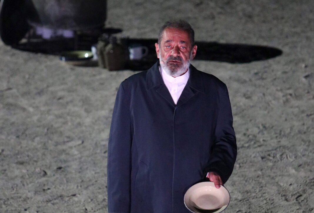 Η παράσταση, που ανεβαίνει στο θέατρο Επί Κολωνώ, εξερευνά θέματα πίστης και αμφιβολίας, με τον Καφετζόπουλο να μοιράζεται τη σκηνή με τον Ζερόμ Καλούτα.