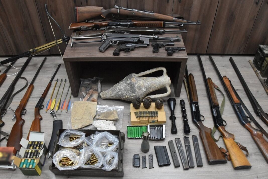 Στο Ρέθυμνο, ένας 77χρονος συνελήφθη καθώς διατηρούσε στο σπίτι του ένα ολόκληρο οπλοστάσιο, το οποίο περιλάμβανε όπλα, εκρηκτικά και αρχαία αντικείμενα. Η αστυνομική επιχείρηση πραγματοποιήθηκε στον Άγιο Βασίλειο, όπου βρέθηκαν μεταξύ άλλων πιστόλια, μακρύκανα όπλα, χειροβομβίδες, φυσίγγια, δυναμίτες, καθώς και αρχαιολογικά ευρήματα όπως ένας πήλινος αμφορέας. Η υπόθεση διερευνάται από την Υποδιεύθυνση Δίωξης και Εξιχνίασης Εγκλημάτων Ρεθύμνου.
