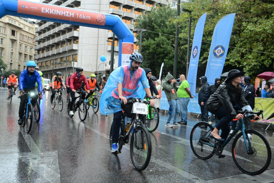 Ο «29ος Ποδηλατικός Γύρος Αθήνας» διεξάγεται υπό βροχή με τους συμμετέχοντες να έχουν κατακλύσει με τα ποδήλατά τους το κέντρο της πρωτεύουσας για να συμμετάσχουν στον αγώνα.