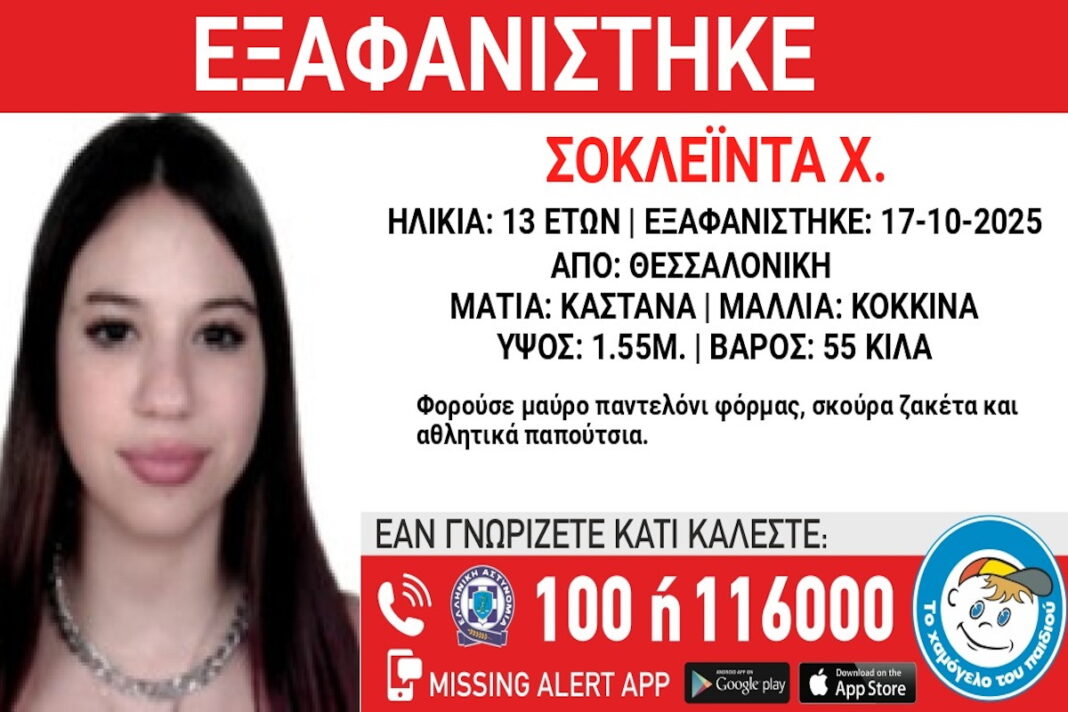 Συναγερμός έχει σημάνει στη Θεσσαλονίκη για την εξαφάνιση της 13χρονης Σοκλέϊντα Χ., η οποία χάθηκε στις 17 Οκτωβρίου 2025 από χώρο φιλοξενίας ανηλίκων.